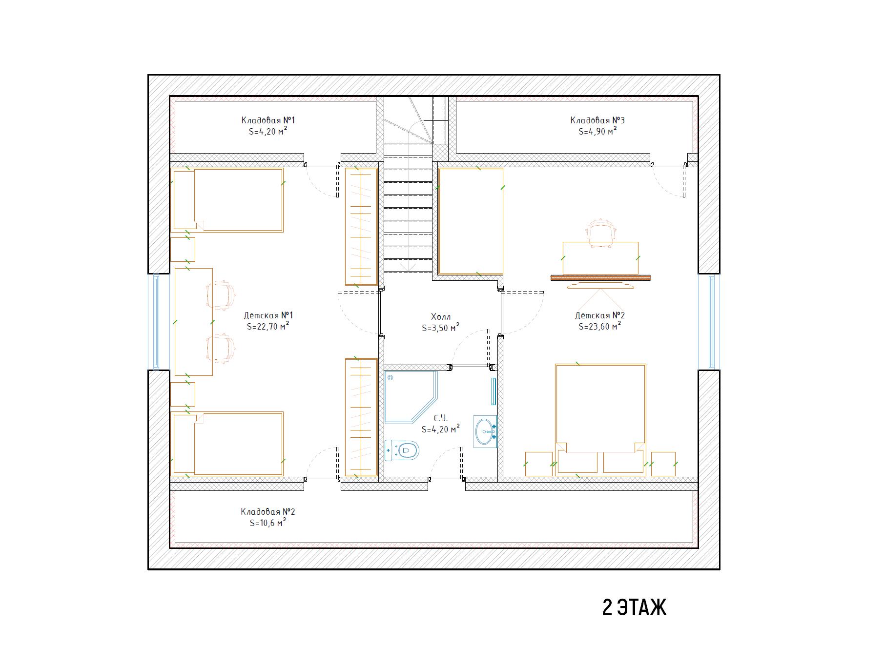 2 этаж: Две спальни (22,7/23,6) с французскими балконами, с/у с душевой, много мест для хранения.