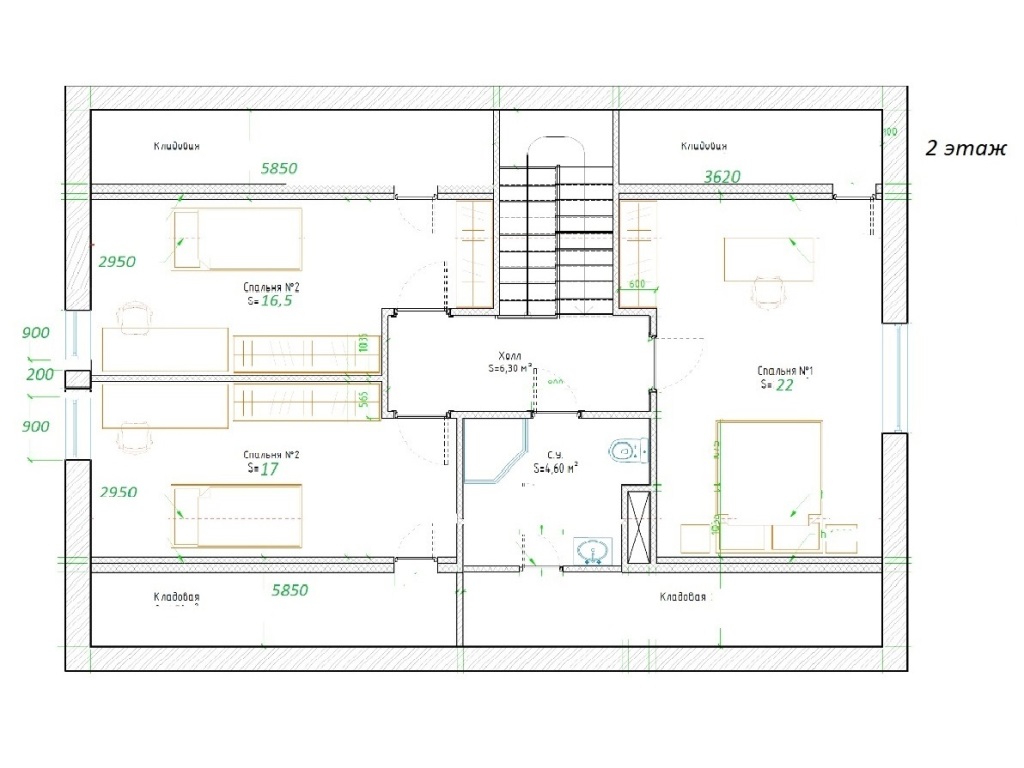 2 этаж: Три спальни (17/16/22), с/у с душевой, много мест для хранения.
