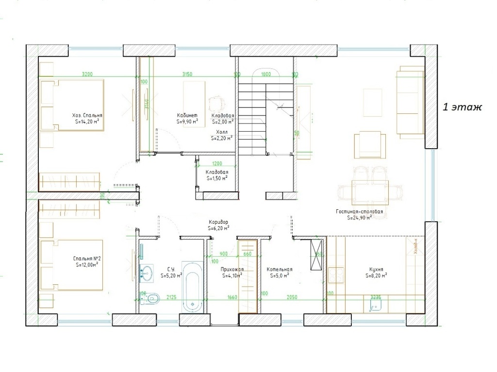 1 этаж: Просторная кухня-гостиная 33 кв.м с окнами на три стороны света и панорамной дверью на крытую террасу; три комнаты (10/12/14 кв.м), ванная комната, бойлерная, гардеробная, прихожая.